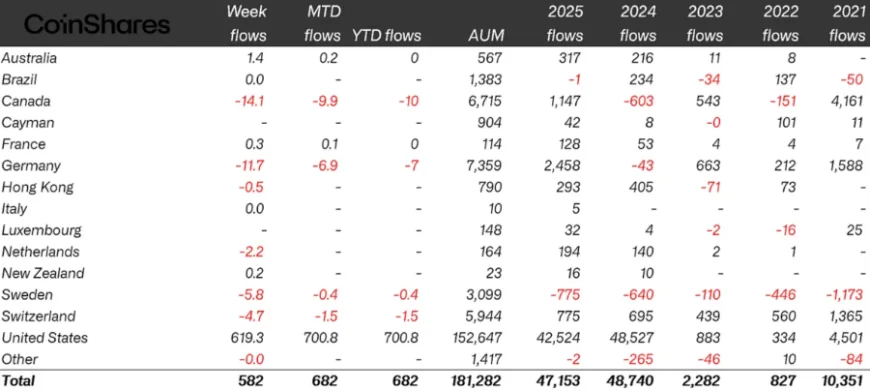 Bên cạnh Hoa Kỳ, một số thị trường khác cũng ghi nhận sự bứt phá rõ nét. Đức là quốc gia có mức tăng trưởng ấn tượng, khi dòng vốn vào các sản phẩm đầu tư tiền điện tử tăng vọt từ 43 triệu USD trong năm 2024 lên 2,5 tỷ USD trong năm 2025. Canada cũng cho thấy sự phục hồi đáng chú ý, với dòng vốn tăng từ 600 triệu USD lên 1,1 tỷ USD trong cùng kỳ.