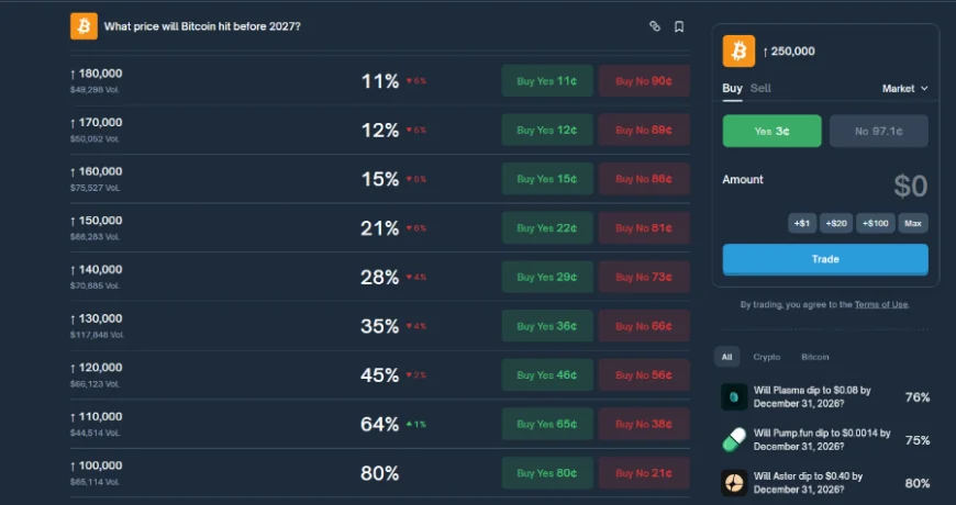 Dữ liệu từ nền tảng thị trường dự đoán Polymarket cho thấy tâm lý giới đầu tư hiện khá thận trọng. Trong cuộc khảo sát với câu hỏi “Bitcoin sẽ đạt mức giá bao nhiêu trước năm 2027?”, xác suất các nhà đầu tư tin rằng BTC chạm mốc 150.000 USD chỉ ở mức 21%.