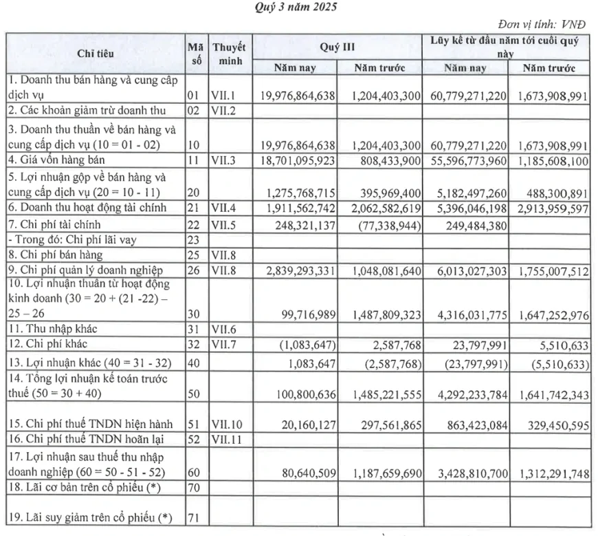 Lũy kế 9 tháng đầu năm, công ty ghi nhận doanh thu thuần gần 61 tỷ đồng và lợi nhuận trước thuế hơn 4 tỷ đồng, lần lượt cao gấp 36 lần và gần 3 lần cùng kỳ năm ngoái.