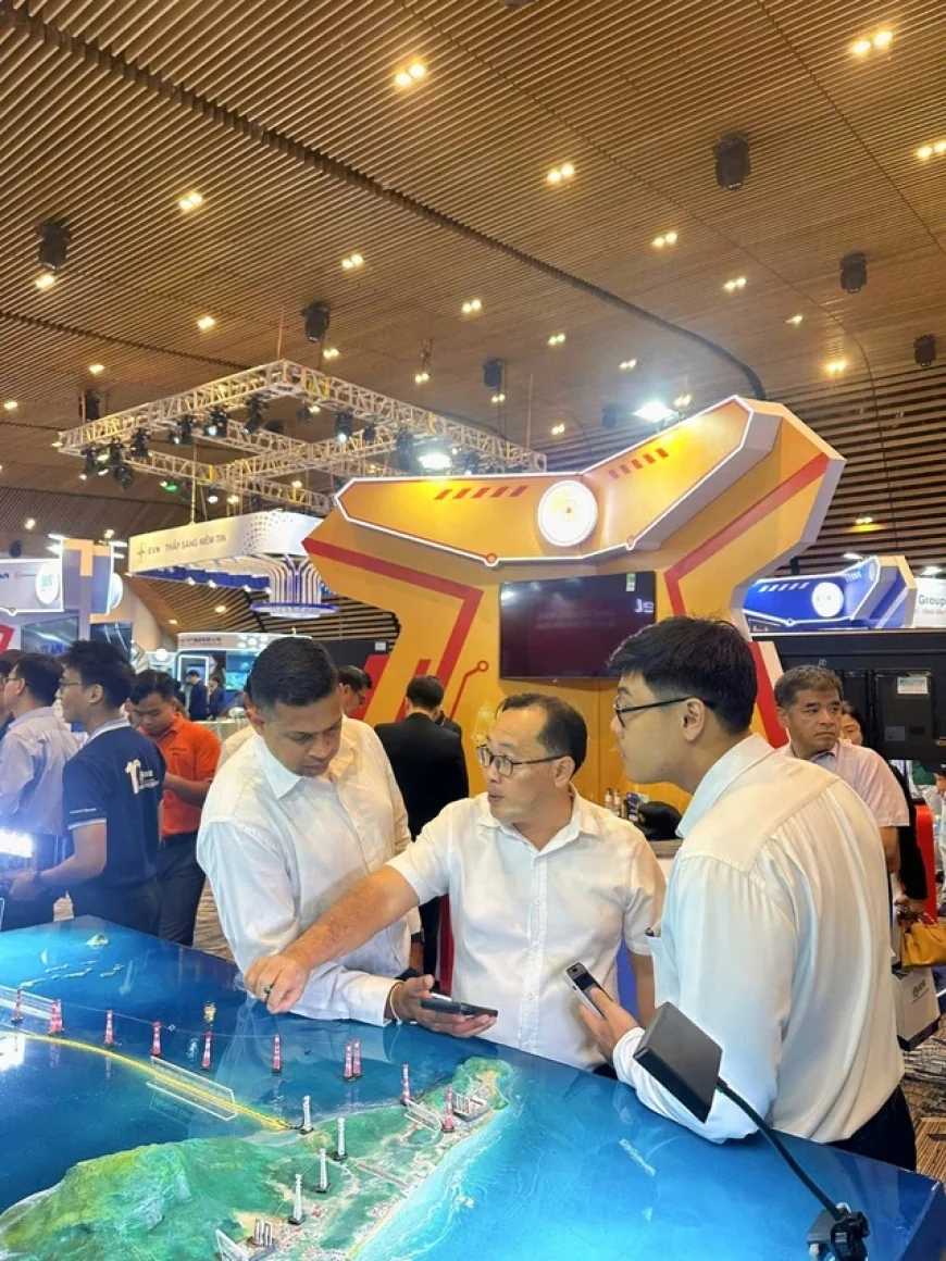 Trong bức tranh công nghệ đó, gian hàng của Tổng công ty Điện lực miền Nam (EVNSPC) ghi dấu ấn mạnh mẽ với 10 sản phẩm, không chỉ minh chứng cho năng lực làm chủ công nghệ, mà còn truyền đi thông điệp ngành điện miền Nam luôn nỗ lực làm chủ công nghệ, chuyển đổi số và lấy khách hàng làm trung tâm. Một trong những điểm thu hút lớn nhất là mô hình sa bàn tái hiện 2 công trình trọng điểm thể hiện trí tuệ và bản lĩnh của ngành điện miền Nam. Đó là tuyến cáp ngầm 110 kV Hà Tiên - Phú Quốc và đường dây 220 kV Kiên Bình - Phú Quốc. Hai công trình nâng tổng công suất truyền tải ra đảo lên gấp 5 - 6 lần, bảo đảm nhu cầu điện đến năm 2035, tạo nền tảng để Phú Quốc phát triển thành trung tâm du lịch chất lượng cao.