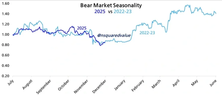 Biểu đồ giá cho thấy Bitcoin không có dấu hiệu tăng giá trong tháng cuối cùng của năm 2025. Nếu kịch bản như năm 2022 tiếp tục diễn ra, Bitcoin có thể không thực sự phục hồi cho đến quý 1 năm sau.