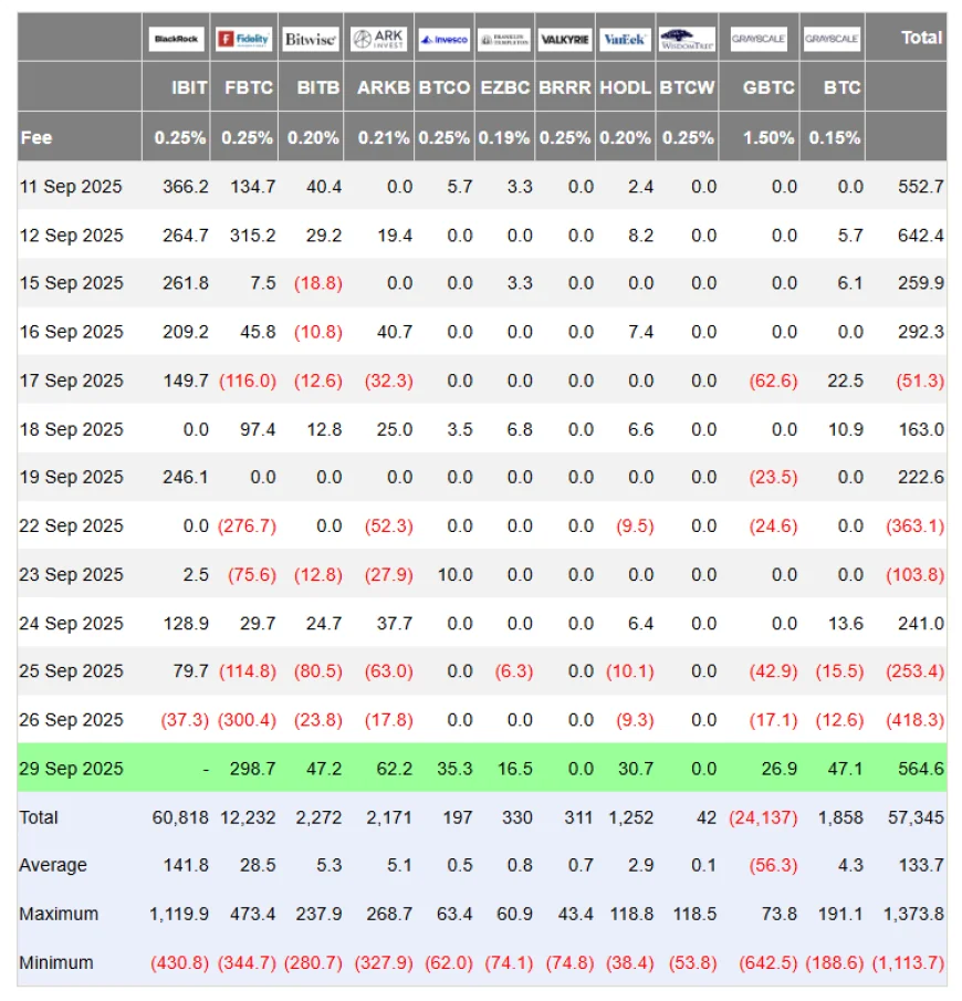 Tuy nhiên, đến ngày 29.9, xu hướng đảo chiều rõ rệt khi dòng tiền quay trở lại mạnh mẽ với mức 564,6 triệu USD. Điều này trùng hợp với đà phục hồi của Bitcoin lên trên 114.500 USD, cho thấy ETF tiếp tục là động lực chính hỗ trợ giá.
