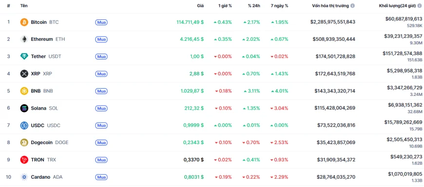 Tính đến sáng 30.9, giá Bitcoin (BTC) ghi nhận quanh 114.705 USD, tăng 2,15% trong 24 giờ qua.