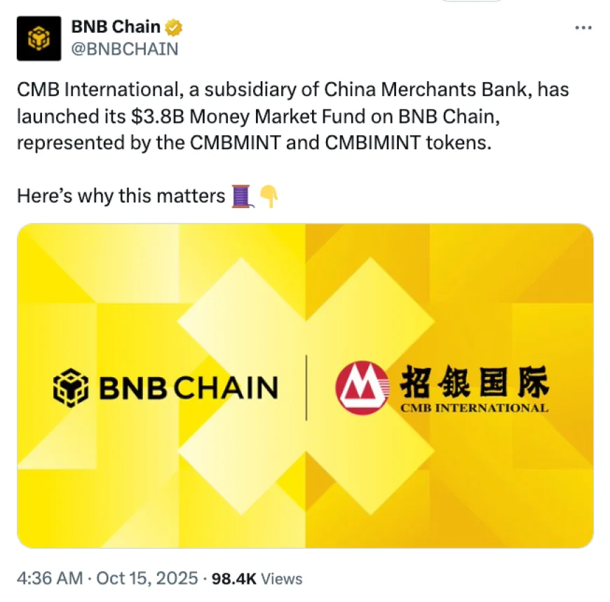 CMB International, công ty con của Ngân hàng Thương mại Trung Quốc (China Merchants Bank – CMB), đã mã hóa quỹ thị trường tiền tệ trị giá 3,8 tỷ USD trên BNB Chain, đánh dấu một bước tiến mới trong làn sóng số hóa tài sản thực (RWA) tại Hồng Kông.