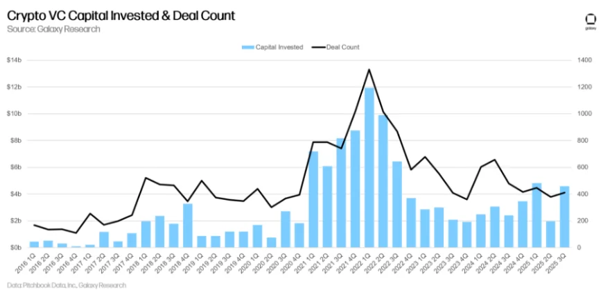 Trong các chu kỳ tăng giá trước đây, đặc biệt vào năm 2017 và 2021, hoạt động đầu tư mạo hiểm thường tăng song hành với giá tiền mã hóa. Nhưng hai năm gần đây, mô hình này không còn đúng: giá tăng, nhưng vốn VC lại giảm mạnh.