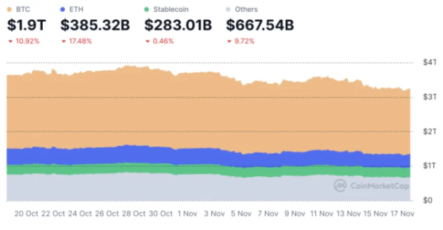 Dữ liệu của CoinGecko cũng cho thấy vốn hóa toàn thị trường đã giảm mạnh trong một tuần, từ 3,7 nghìn tỷ USD (ngày 11/11) xuống còn quanh 3,2 nghìn tỷ USD hôm nay.