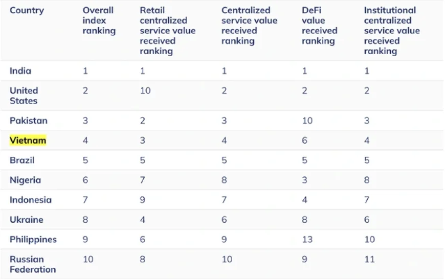 Theo bảng xếp hạng của Chainalysis, Việt Nam đứng trên Brazil (top 5), sau Pakistan (top 3). Ấn Độ tiếp tục đứng đầu bảng xếp hạng trong khi Mỹ bất ngờ vươn lên vị trí thứ hai, tăng ba bậc so với năm ngoái.